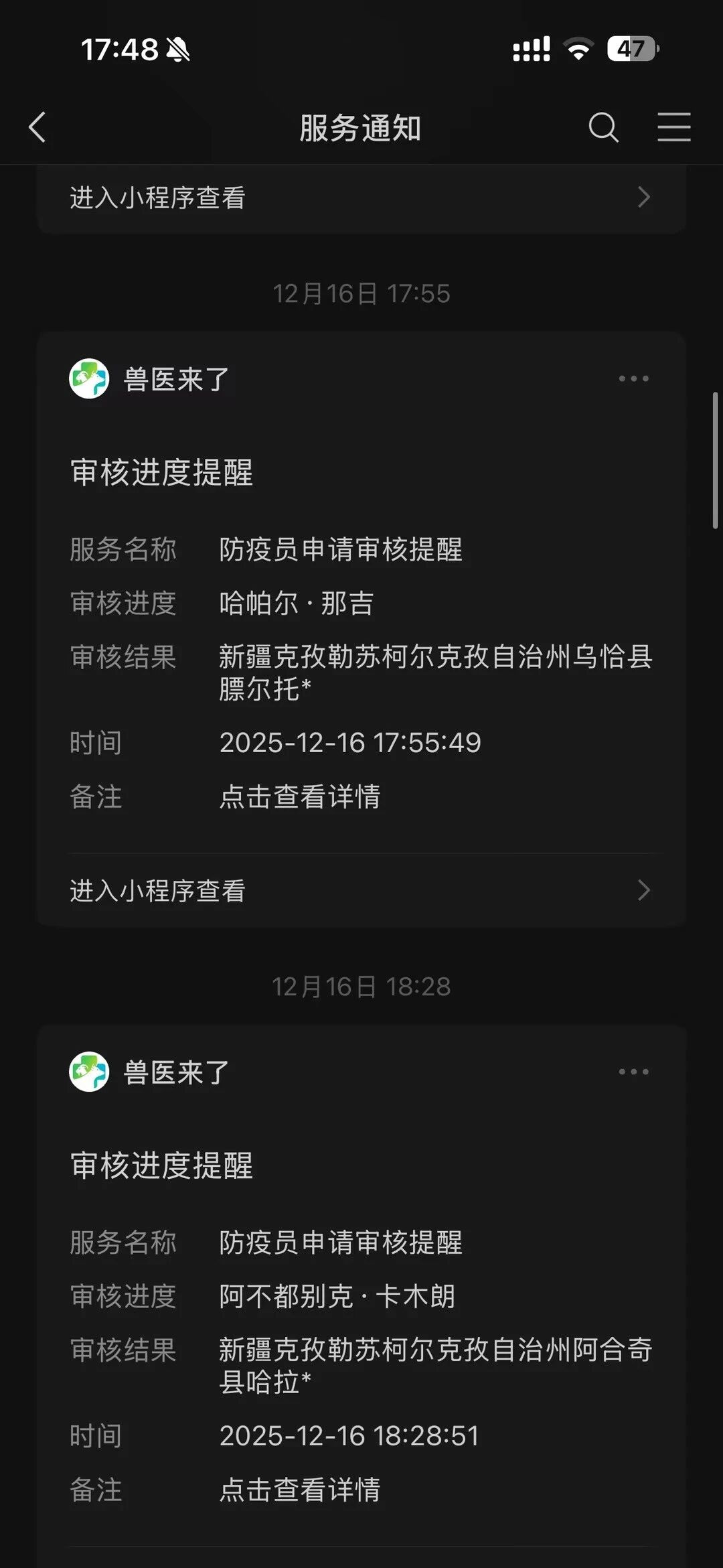 下图这个是我们为新疆畜牧科学院兽医研究所开发的“兽医来了”小程序中的服务通知,“兽医智疗也是参考同样的模式”,请审核员查看