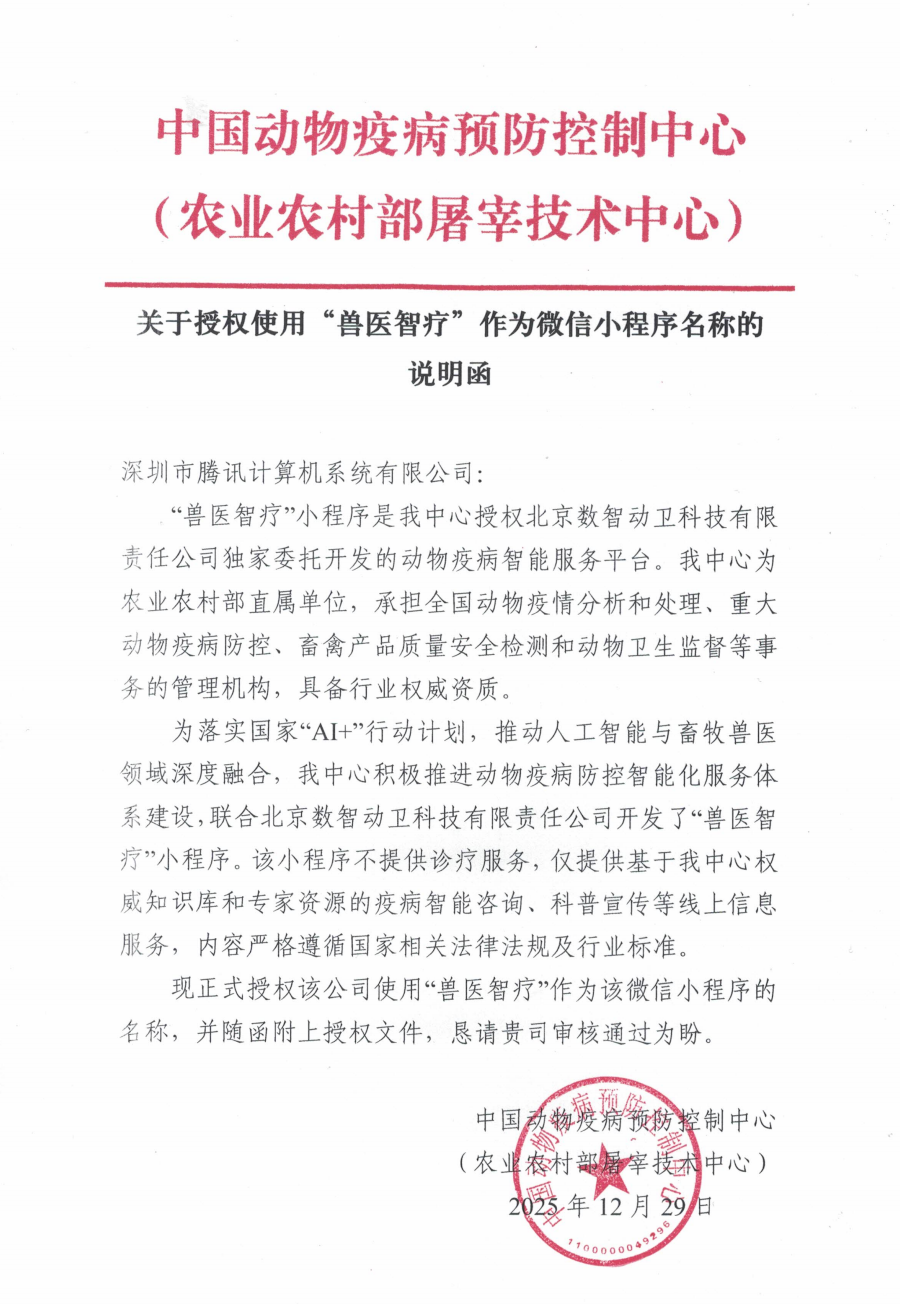 为落实国家“AI+”行动计划,推动人工智能与畜牧兽医领域深度融合,中国动物疫病预防控制中心积极推进动物疫病防控智能化服务体系建设,联合北京数智动卫科技有限责任公司开发了“兽医智疗”小程序。该小程序提供基于我中心权威知识库和专家资源的疫病智能咨询、科普宣传等线上信息服务,内容严格遵循国家相关法律法规及行业标准。