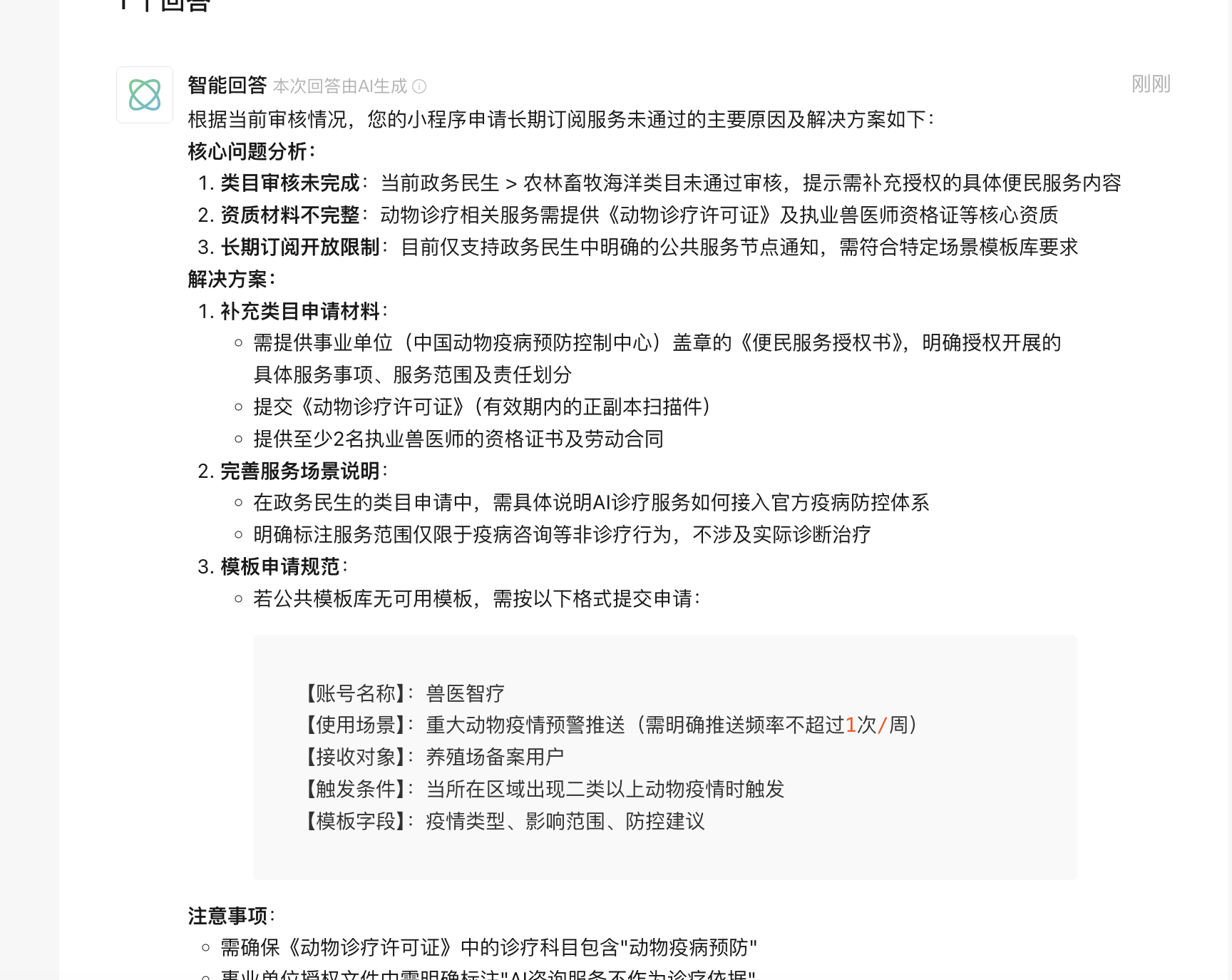 目前我们开发的兽医智疗小程序是受中国动物疫病预防控制中心委托,为一线养殖户提供免费、公益的疫病咨询的民生服务类小程序,旨在通过AI+为降低养殖风险。