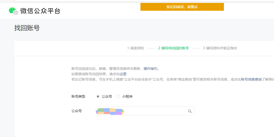 找回账号时,输入公众号名字,提示验证码错误,请重试,是怎么回事?