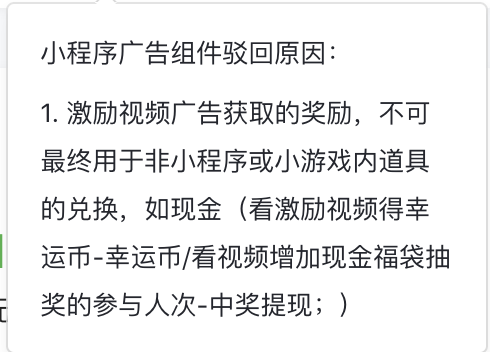 我们已经按照要求整改了小程序,但是广告组件却一直都是以 理由被驳回。