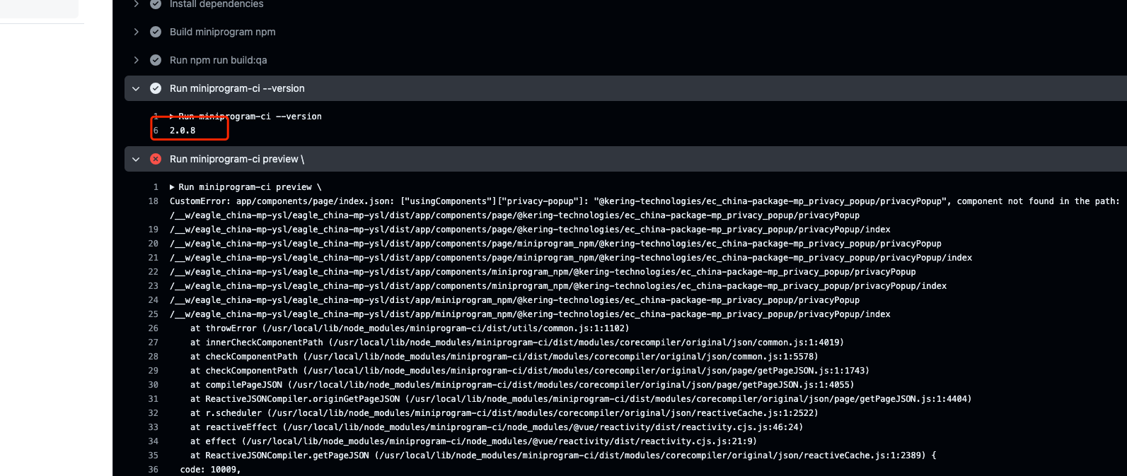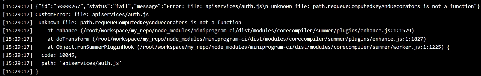 at Object.runSummerPluginHook (/usr/local/lib/node_modules/miniprogram-ci/dist/modules/corecompiler/summer/worker.js:1:1225) {