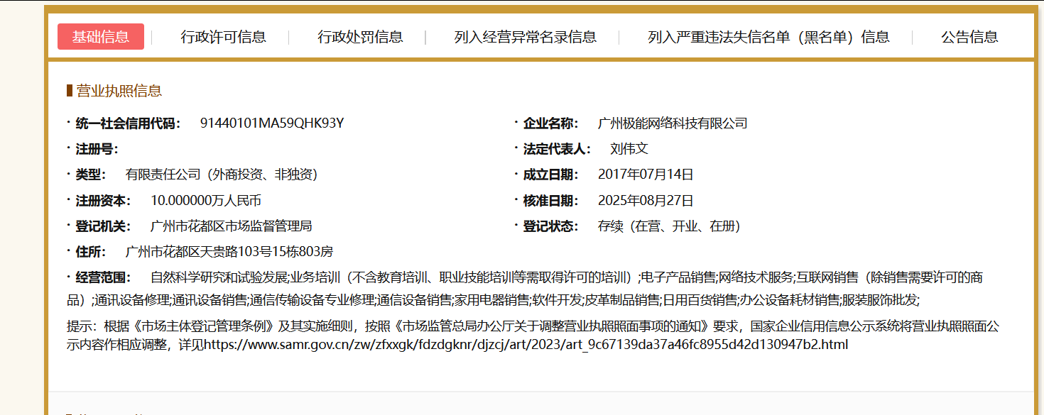公司主体是广州极能网络科技有限公司。