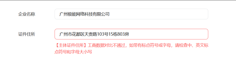 填写的地址是广州市花都区天贵路103号15栋803房。地址检测了无空格,无换行。
