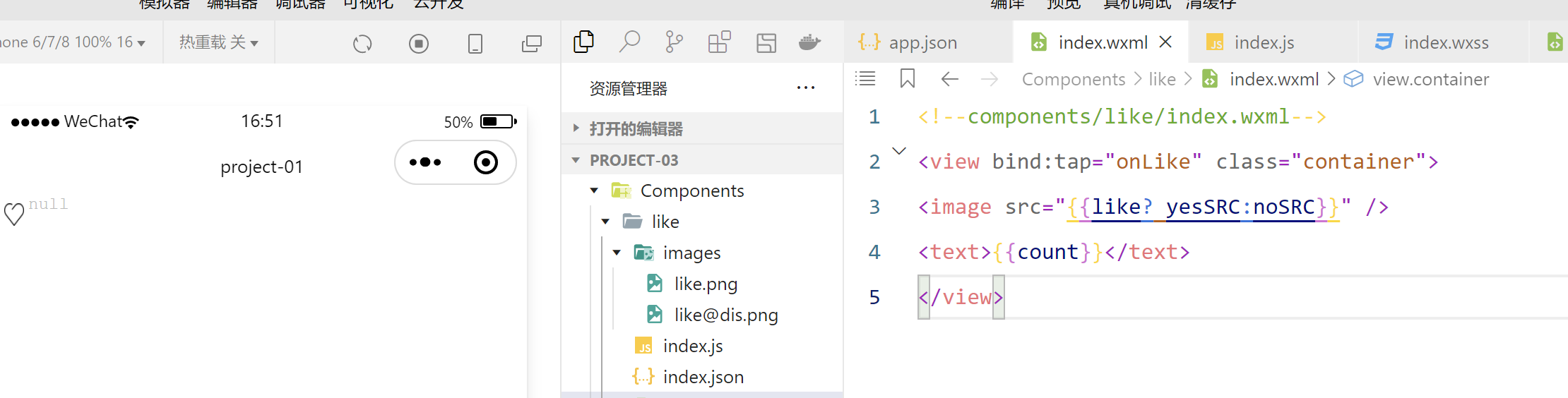 data中要有对应的属性,在wxml上才能使用。在data中设置下count 和like