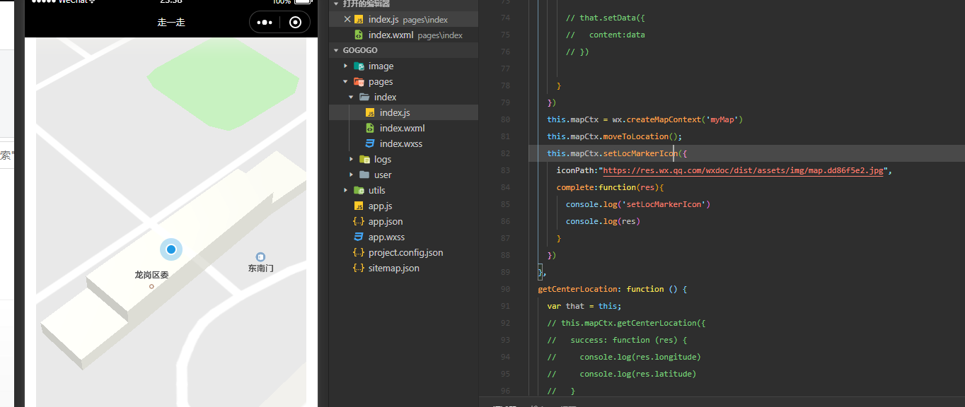 this.mapCtx = wx.createMapContext('mapId'); this.mapCtx.setLocMarkerIcon({ iconPath:'../../image/location.png' }); //手机看,IDE看不出来setLocMarkerIcon还有一条,使用setLocMarkerIcon和wx.getLocation不要同时使用,不然setLocMarkerIcon不生效