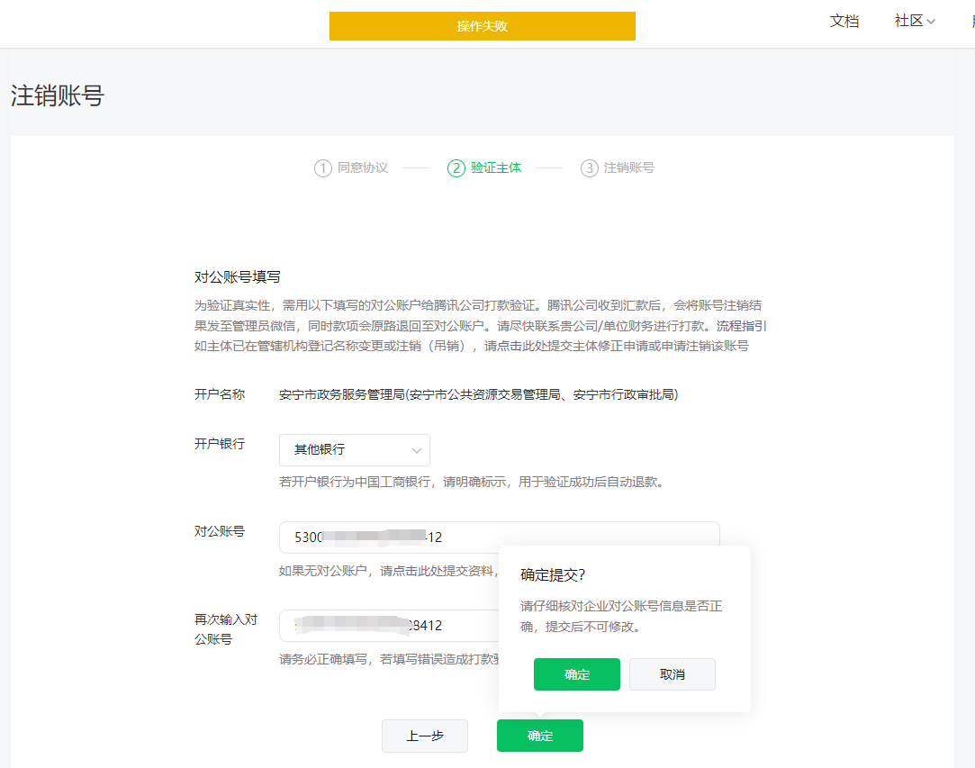 按页面提示进行账号注销,在验证主体时,提示操作失败,不知道是什么原因,反复试了几天都不行