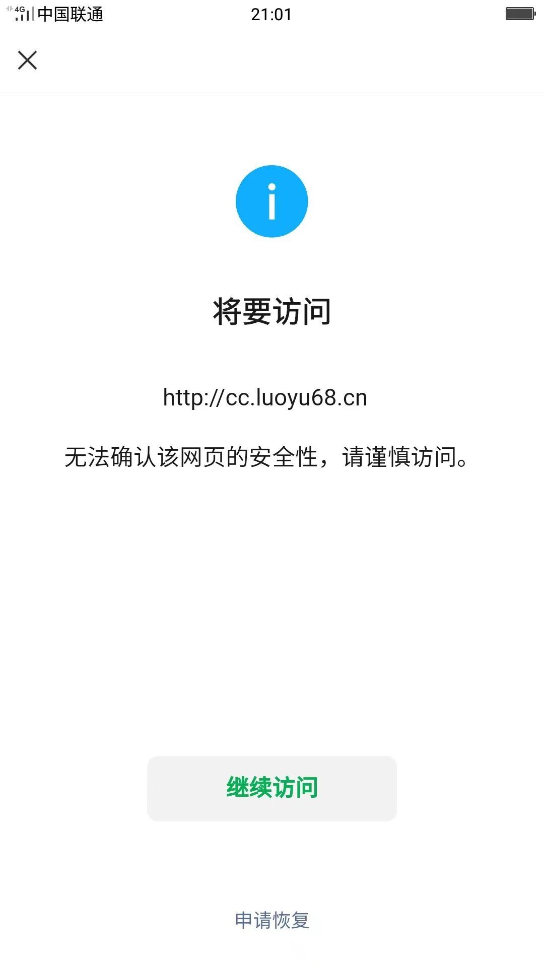 您好,域名(cc.luoyu68.cn),普通的企业展示型网站,微信分享给别人访问网站出现提示“无法确认该网页的安全性,请谨慎访问”经检查网页里没有不安全的内容,请核实后帮忙解除拦截,谢谢!