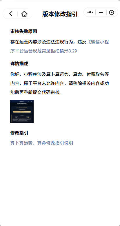 代码审核环节,将会对小程序运营的内容与所选类目是否相符进行核实,当小程序涉及提供算卜算运势、算命等内容,属于平台未允许的内容,需要整改后再重新提交,否则代码审核环节将面临因内容不符被驳回情形。