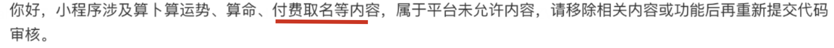 微信小程序审核严重双标,我的起名软件没有设计任何传统算命运势被封禁、审核不通过,线上一大堆付费起名小程序却安全运营。严重怀疑这里面有黑幕!!!