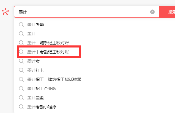 我们有一款小程序原名叫 "墨计考勤" 前1周刚刚改名成 "墨计 | 考勤记工秒对账" , 有一用户之前没有用过我们的产品, 他在小程序搜索界面键入 "墨计" 时, 提示列表中并没有出现我们的应用 ( "墨计考勤", "墨计 | 考勤记工秒对账" 都没有, 如图所示) (图中出现的 "墨计 | 随手记工秒对账" 是另一个产品, 相差2个字)