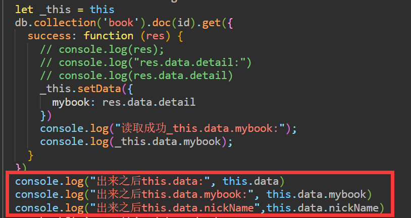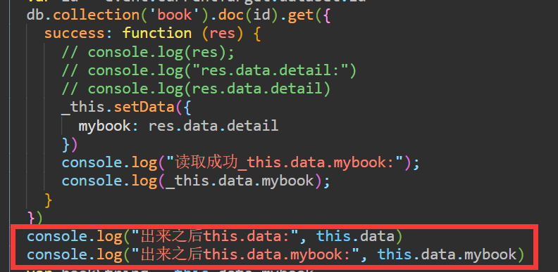 // 要么在回调里处理 db.collection(..).where().get({ success(res){ // 打印,赋值全部在这里处理 } })// 要么使用async / await xxxxx: async function(){ var res = await db.collection(..).where().get() // 这时可以在后面打印,赋值等等操作 console.log(res) }若认为该回答有用,给回答者点个[ 有用 ],让答案帮助更多的人
