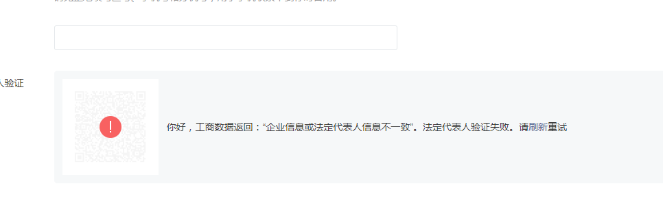 你好,核查发现填写的主体名称与营业执照上的主体名称不一致,故法人验证失败。请严格按照营业执照的主体名称填写。