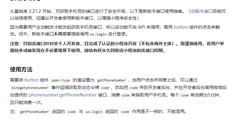 新版本的getPhoneNumber返回值中有个code,但是基础库2.21.2才能获取到,老版本的getPhoneNumber目前就获取不到手机号了 下面是代码