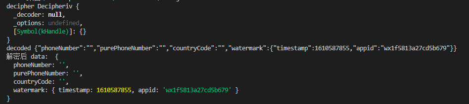 小程序通过按钮绑定getPhoneNumber,获取encryptedData和iv提供给服务端解密,解密没有报错,手机号却是空值,下面是在本地解密后的结果