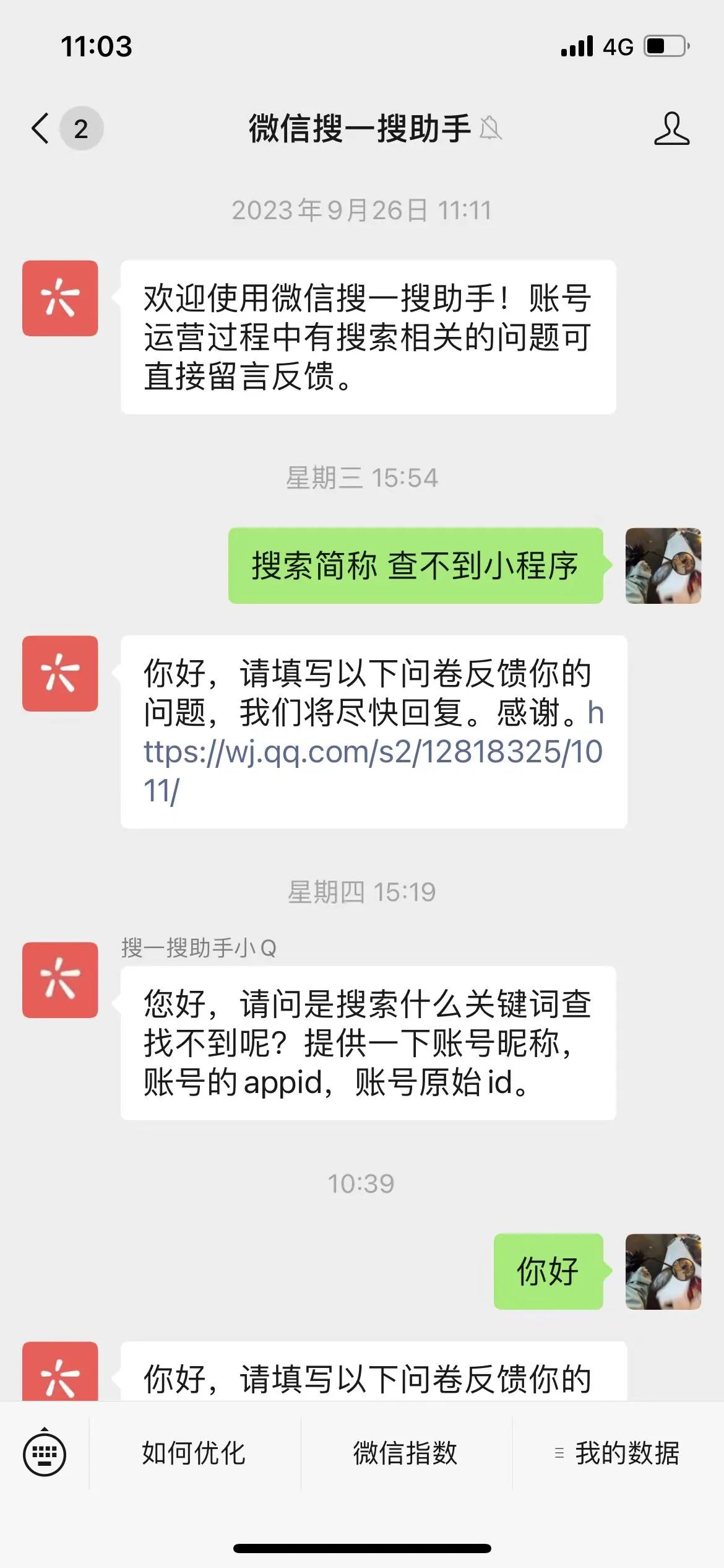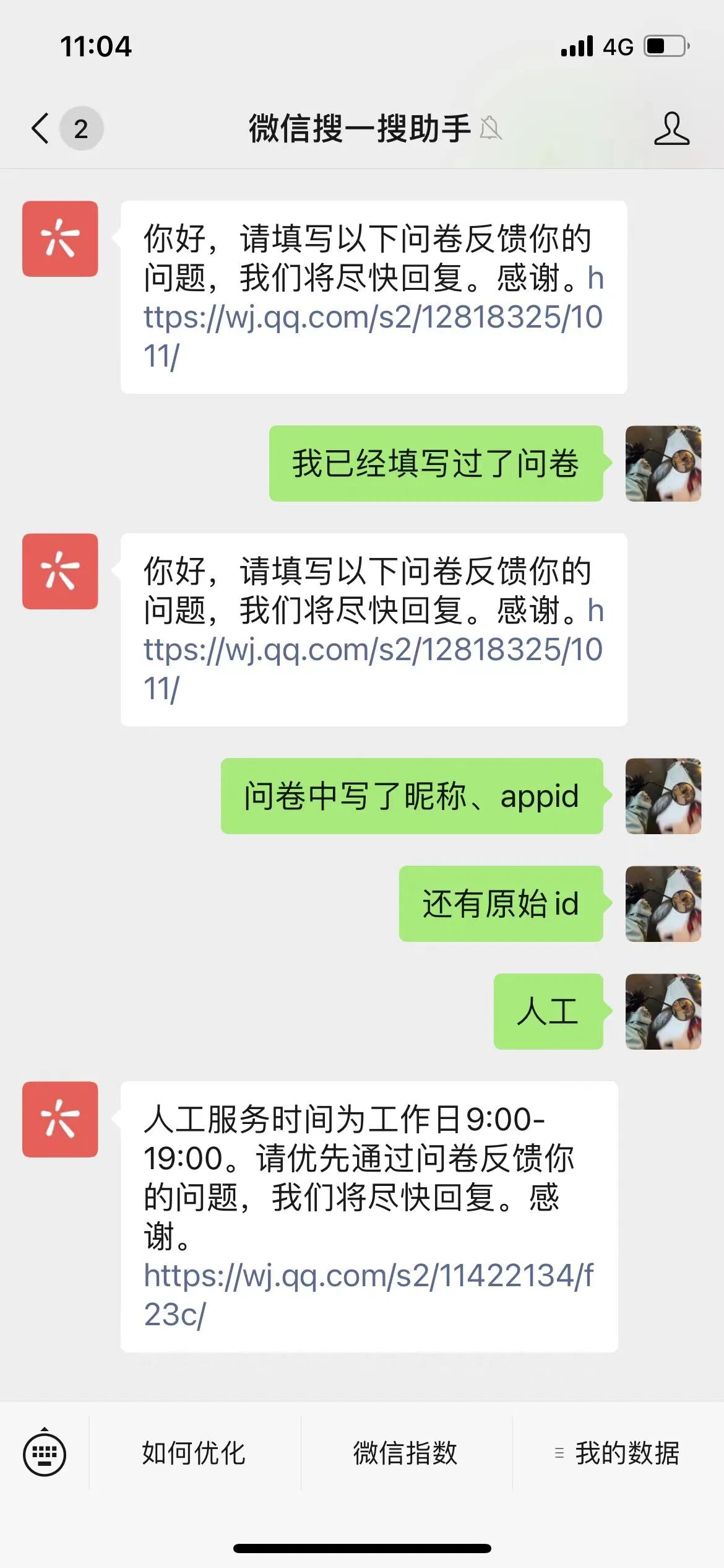 按照腾讯提示,上周三关注了“微信搜一搜助手”,已提交问题,反馈了appid、原始id、小程序全称。没有任何提示的情况下,周四竟然有回复问我昵称、appid、原始id是什么,我已经提交了表单,请问你们是不看的吗?
