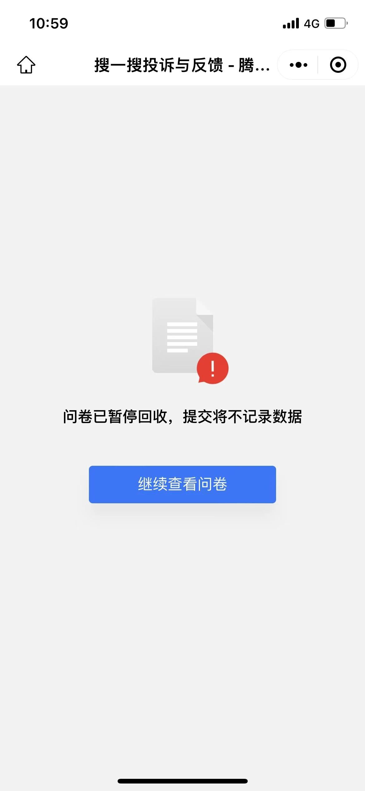 本周一打开“微信搜一搜助手”,再次联系人工,还是让提交表单,可表单界面提示:“问卷已暂停回收,提交将不记录数据”,那请问我如何联系官方呢?我又要通过什么方式等到你们的回复呢?