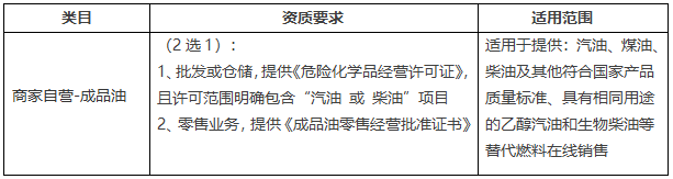 【商家自营-成品油】:适用于提供成品油批发(如:汽油、煤油、柴油等)推广服务(注:暂不支持原油在线配送服务)