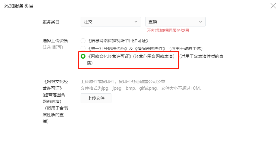 提交资质三选一,我们只能选《网络文化经营许可证》,我们只是普通电商,并非政府或者国企。但是《网络文化经营许可证》政府发文称不包含“直播”了,那我们申请“社交-直播”类目还需要提供《网络文化经营许可证》吗?