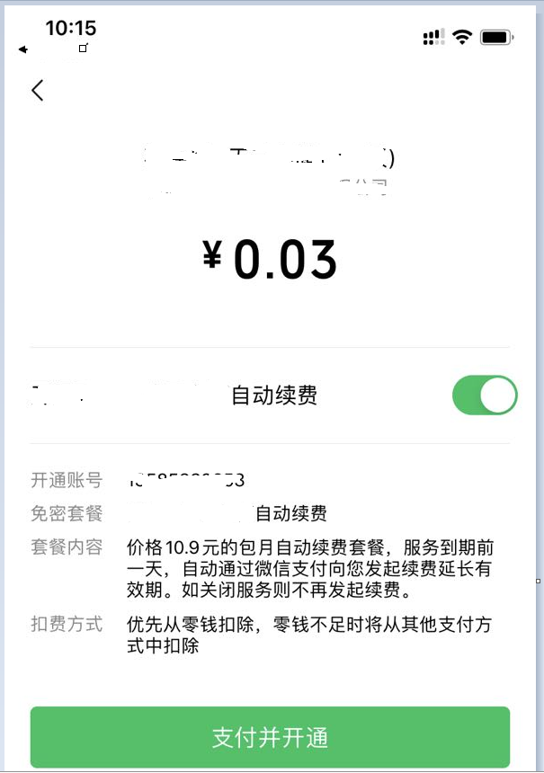 记得以前公司用的自动续费,进去后直接显示自动续费说明,现在我们公司新申请的,采用支付中签约,跳转到签约页面后有个一开通自动续费的按钮,需要用户手动点击后才显示自动续费说明!!! 怎么实现默认展示自动续费的说明,不用用户去手动选则,因为在我们自己的应用中已经告诉用户开通自动续费了,不需要再微信这个页面再次选择,如下图,怎么取消这个自动续费按钮,或者怎么做到默认就是打开状态