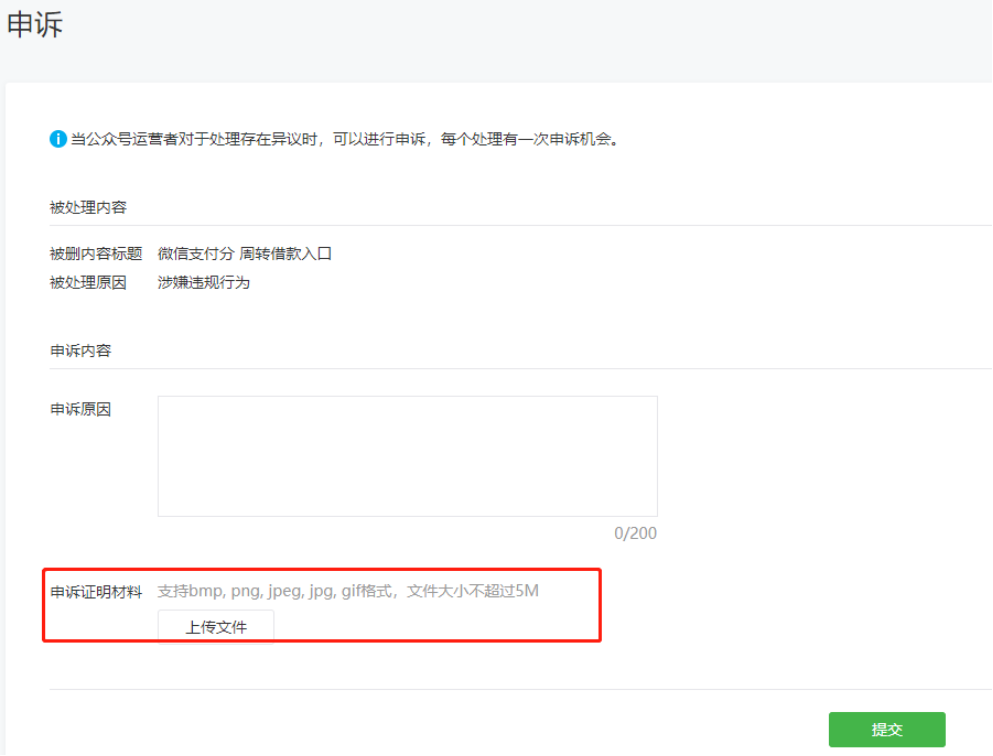(2)上传申诉材料。可上传证明文章未涉及违规的证据或相关资质文件等。