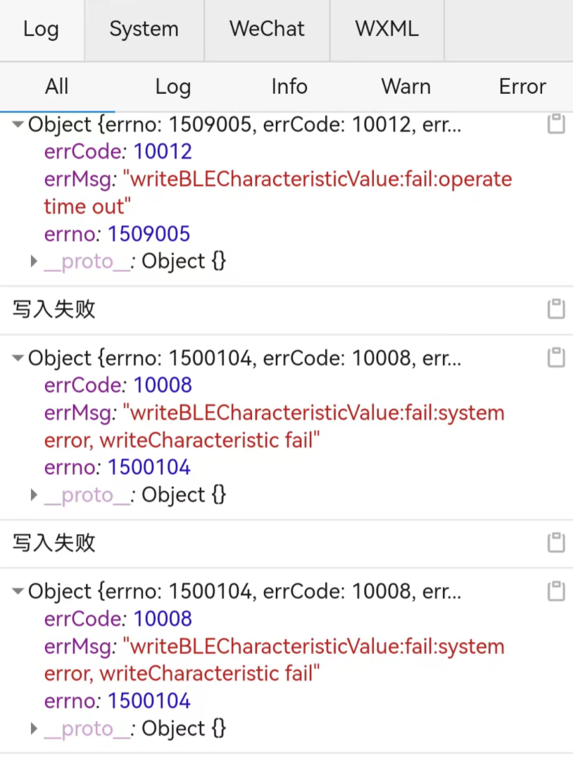 errMsg: "writeBLECharacteristicValue:fail:systemerror, writeCharacteristic fail"