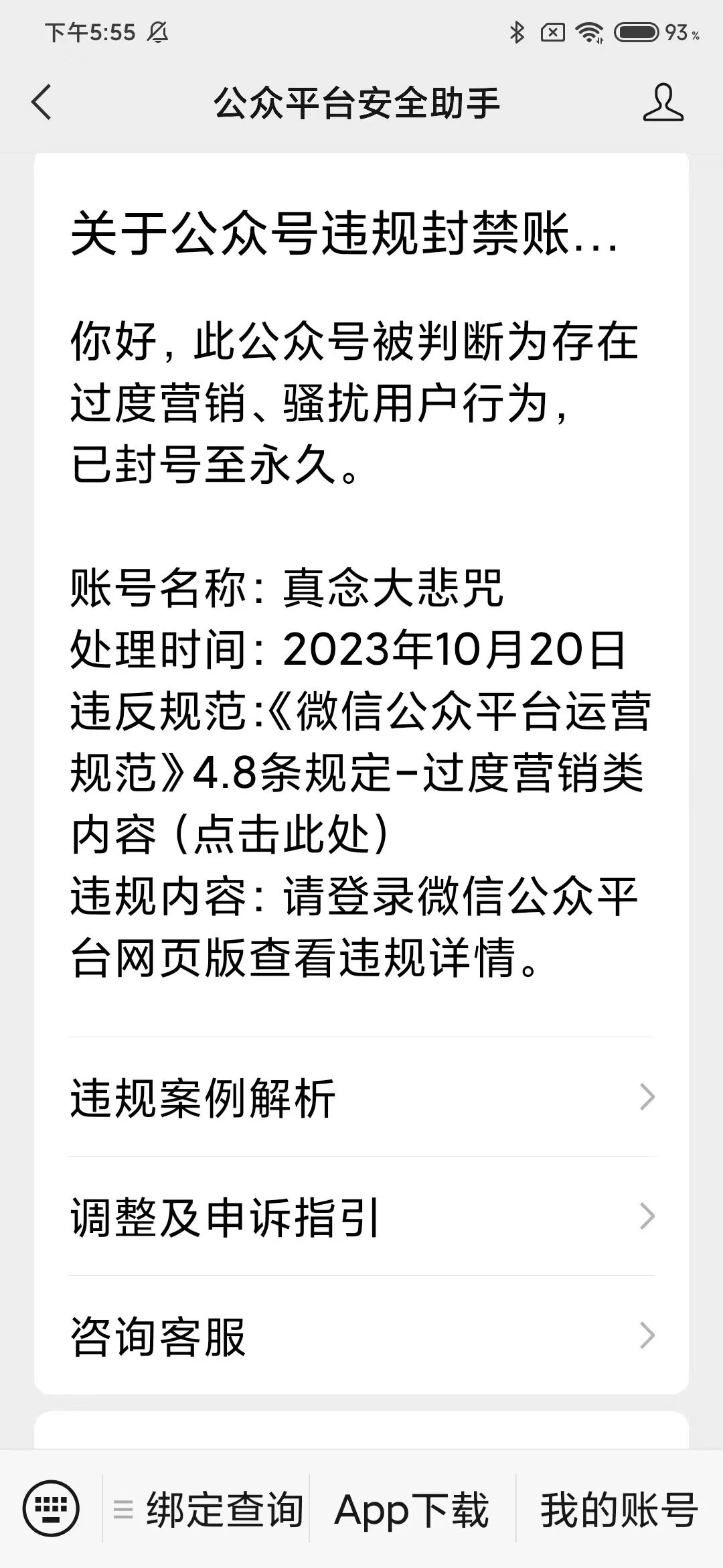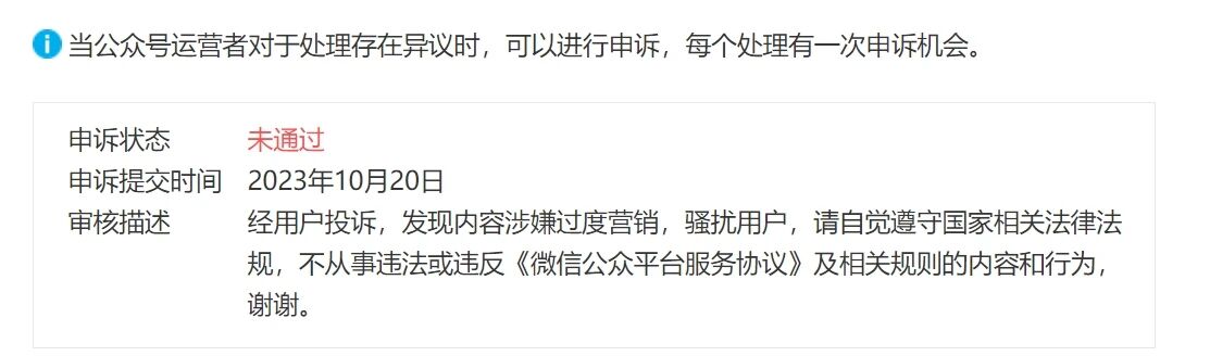 微信公众号审核规则还有没有准了?一个经营2年、超过700天推送,一篇营销广告都没发过,一个产品都没卖过,只开通了流量主,然后因为“过度营销-骚扰用户”被永久封禁,说营销,如果发过广告然后给封了也认了,之前连一篇广告没都发过,营销啥了?又是咋过度了?