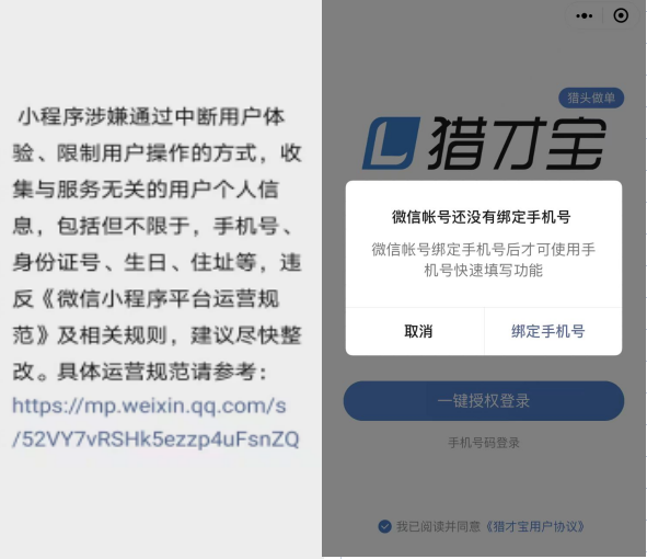 有用户并未在微信上绑定手机号,然后来使用我们的小程序时,微信官方提醒让他绑定手机号