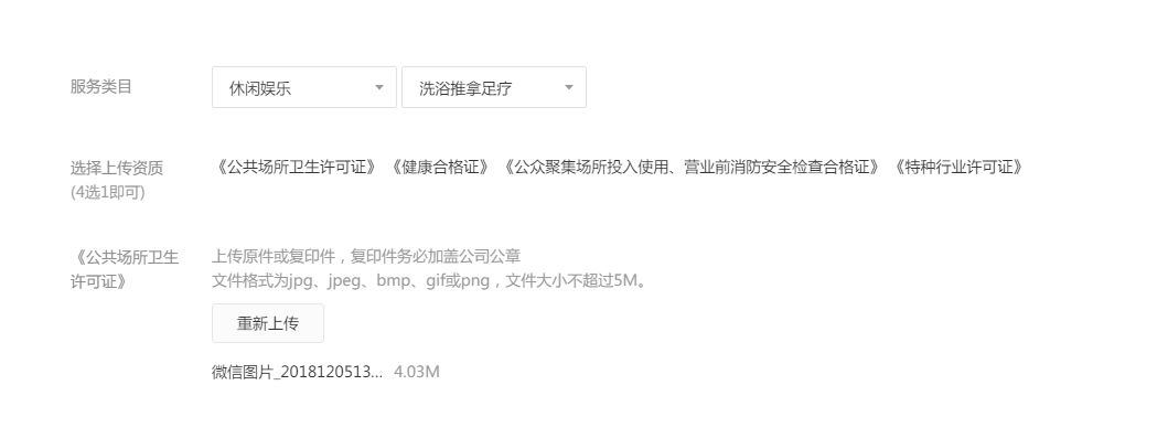 你好,贵司申请的门店小程序类目审核不通过原因为:贵司仅提交了《卫生许可证》,商家类目资质不正确,请根据类目提示上传对应的资质证明材料;洗浴推拿足疗类目需要同时提交《公共场所卫生许可证》、《健康合格证》、《公众聚众场所投入使用合格证》、《营业前消防安全检查合格证》和《特种行业许可证》,请补充提交完整资质证明材料重新申请类目审核