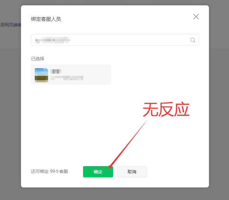 为什么能搜到微信号,就是无法绑定客服。点击确定没有反应。