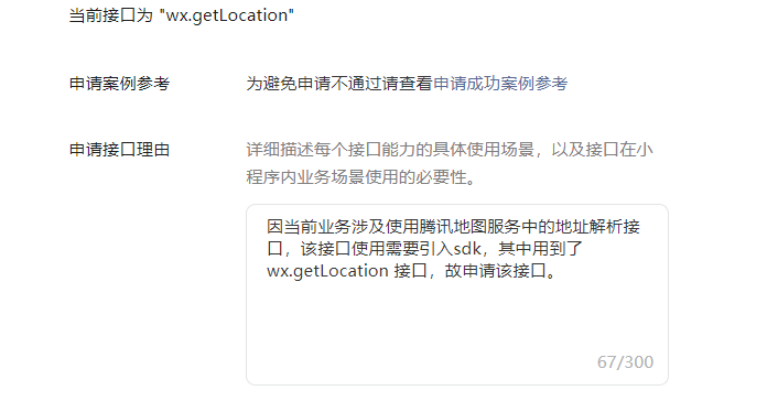 你好,核实到小程序申请wx.getLocation接口审核不通过,根据提交的申请信息可知申请该接口是用于【获取用户定位以便辅助填写地址信息】,不符合wx.getLocation接口使用场景开放范畴。建议使用wx.getFuzzyLocation、wx.chooseLocation或wx.choosePoi、wx.chooseAddress接口实现上述场景。若含有线下网点导航服务,可以支持wx.getLocation接口,建议提供小程序内线下网点导航相关截图和完整录屏(含小程序昵称)重新提交。可参考相关案例解析:https://developers.weixin.qq.com/community/develop/doc/000646718d40a08a65ed1e2175bc09