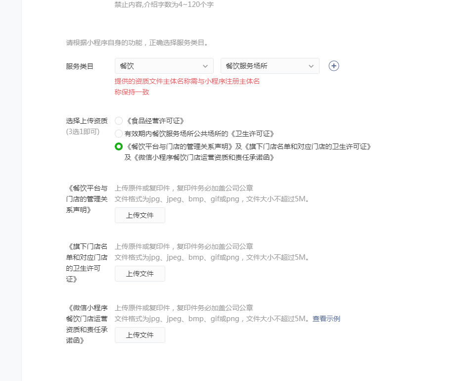 在申请小程序的时候选择类目——餐饮,因为企业主体没有食品经营许可证,所以选择了如图第3个选项,就是提供了旗下门店的食品经营许可证来申请类目,3份资料都已提交,但是还是没有通过,因为是第一次,而且腾讯也没有3个资料的模板,也没有客服电话,联系不上,所以不能确定我们提交的资料是否正确,所以希望您这边能否提供一下3个资料的模板给我们,最好是可以电话联系我们告知如何申请哦