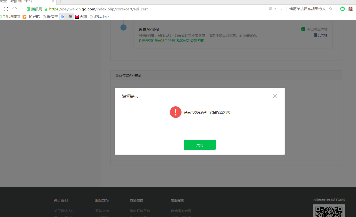微信支付--想增加个ip来着,就是保存失败,然后我看了操作证书,也没过期啊,莫名其妙,昨天还好好的,真是气人