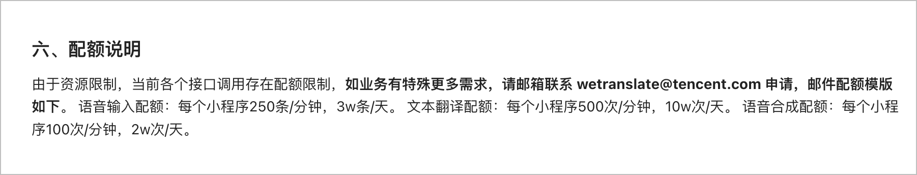 【语音输入配额:每个小程序250条/分钟,3w条/天。文本翻译配额:每个小程序500次/分钟,10w次/天。语音合成配额:每个小程序100次/分钟,2w次/天。】这个是 默认配额,还是邮件配额模板?表述不清晰