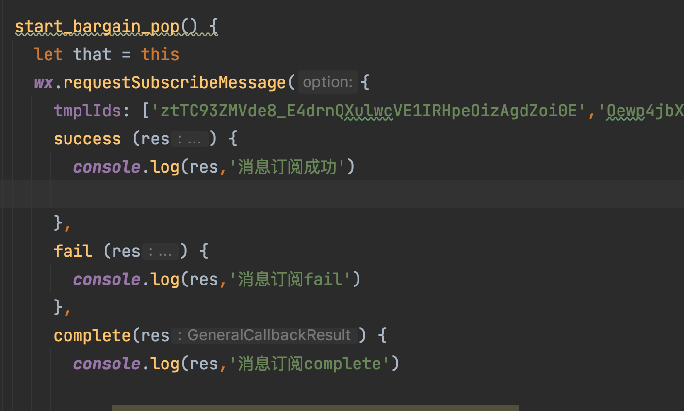 bindtap() { setTimeout(() => { wx.requestSubscribeMessage(); }, 1000); }