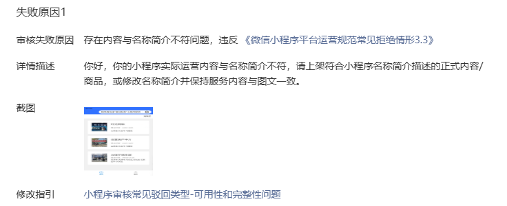 “你好,你的小程序实际运营内容与名称简介不符,请上架符合小程序名称简介描述的正式内容/商品,或修改名称简介并保持服务内容与图文一致。”
