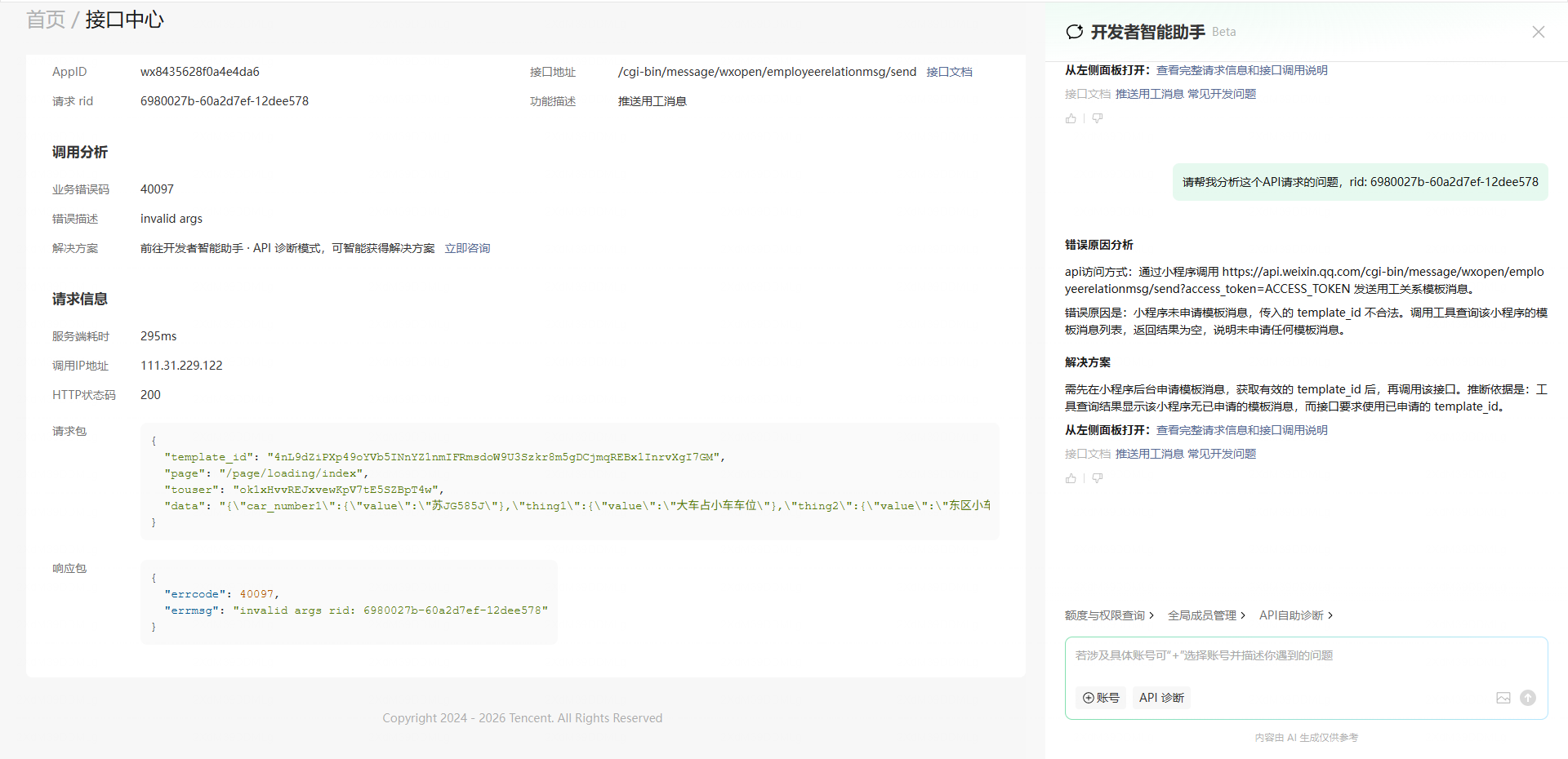但是推送用工消息报错,显示传入的模板id不对。解释一下原因。