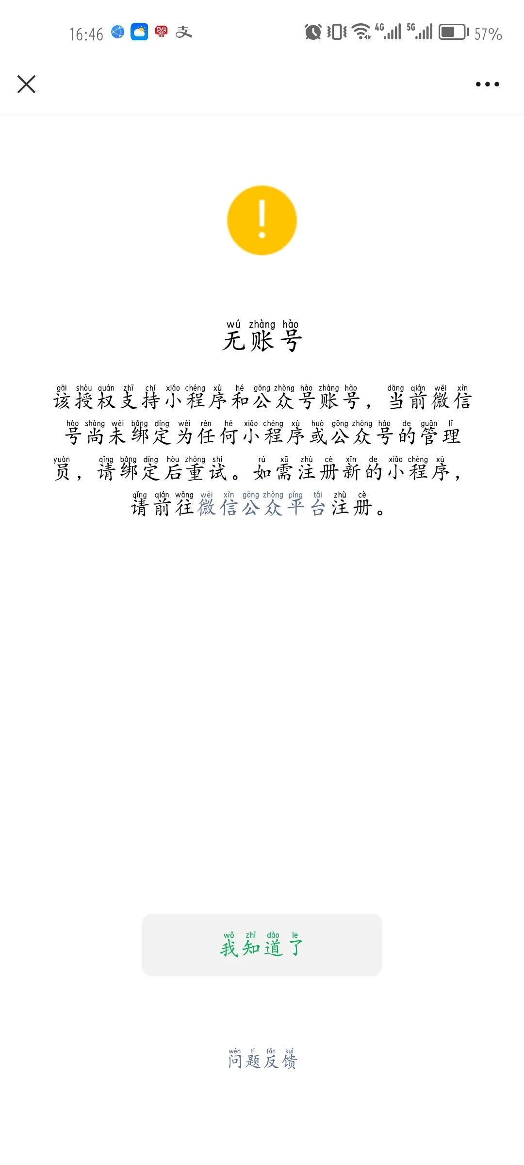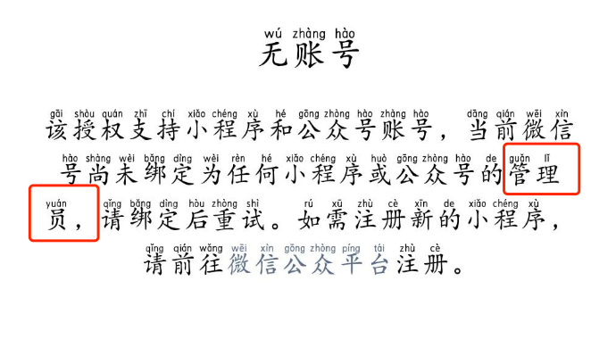 你好,请参考 https://developers.weixin.qq.com/doc/oplatform/Third-party_Platforms/2.0/troubleshooting/authorization_troubleshooting.html#%E4%BA%94%E3%80%81%E5%95%86%E5%AE%B6%E6%8E%88%E6%9D%83%E6%8F%90%E7%A4%BA%E6%97%A0%E6%B3%95%E6%8E%88%E6%9D%83%E3%80%81%E6%97%A0%E8%B4%A6%E5%8F%B7 自助排查