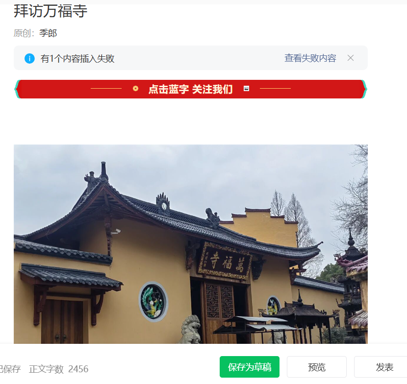 【页面链接】: https://mp.weixin.qq.com/cgi-bin/appmsg?t=media/appmsg_edit&action=edit&reprint_confirm=0×tamp=1771750113721&type=77&appmsgid=549043458&token=484372113&lang=zh_CN在“预览”时显示“有一个内容插入失败”,导致无法预览