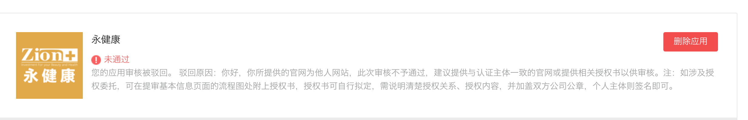 你好,你提交的官网内公司介绍为永龄集团,认证主体为南京永龄医院有限公司,所以被驳回使用他人网;如涉及授权委托,可在提审基本信息页面的流程图处附上授权书,授权书可自行拟定,需说明清楚授权关系、授权内容,并加盖双方公司公章,个人主体则签名即可。