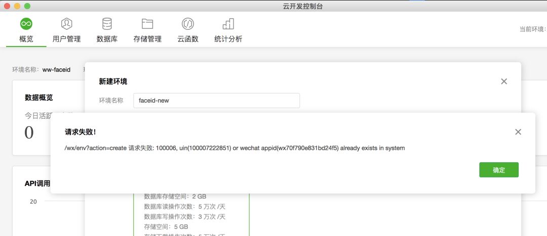 /wx/env?action=create 请求失败: 100006, uin(100007222851) or wechat appid(wx70f790e831bd24f5) already exists in system