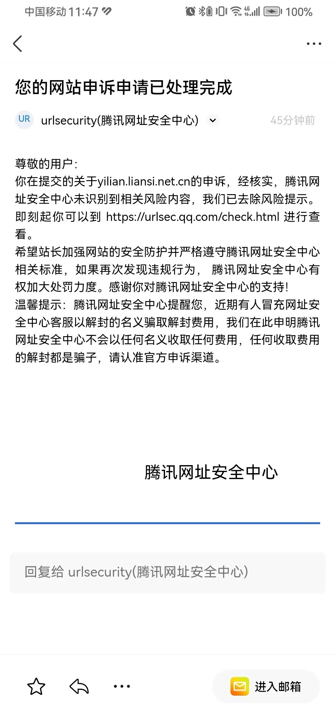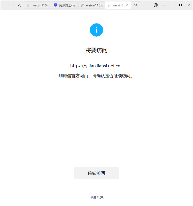 https://yilian.liansi.net.cn 已经申诉成功 为什么打开微信还是提示非微信官方网页,请确认是否继续访问。