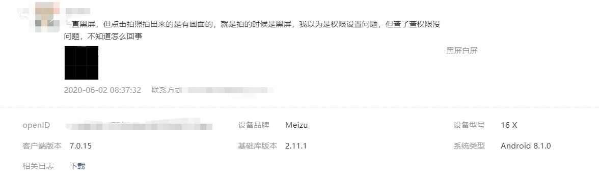 该版本出现 camera 组件区域完全空白不显示摄像头内容,访问所有线上使用 camera 组件的小程序都这样,但拍照还是是支持的