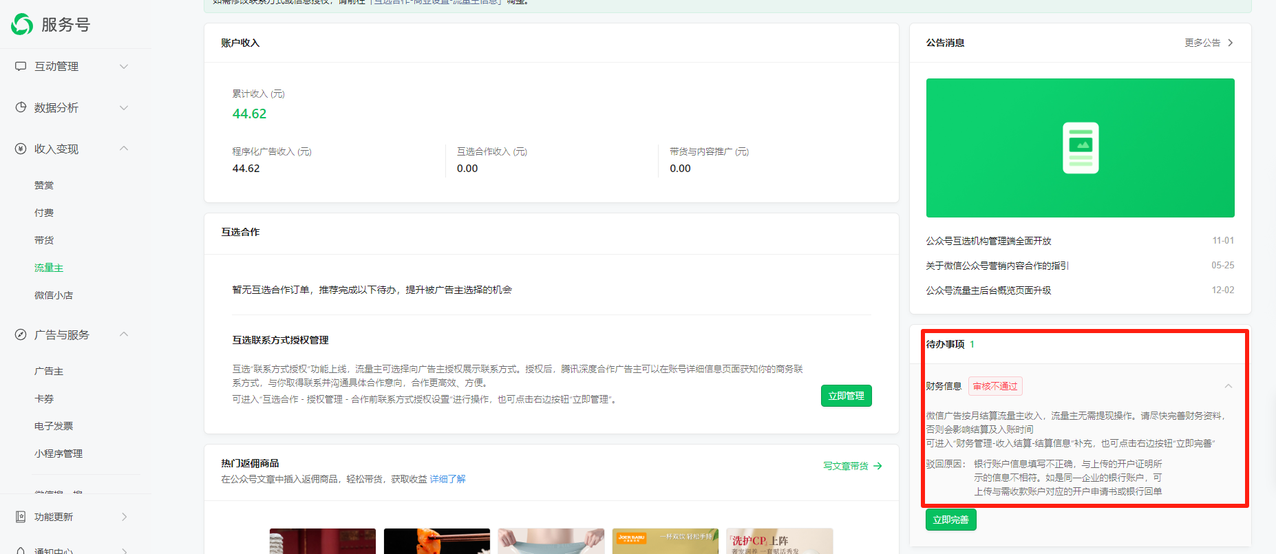 公众号流量主账号收入提现问题,公司当年的开户行银行已被取消合并,开户行有每年审核,但银行账户更改为其他行了,公众号审核财务信息“审核不通过”,怎样设置才能提现?