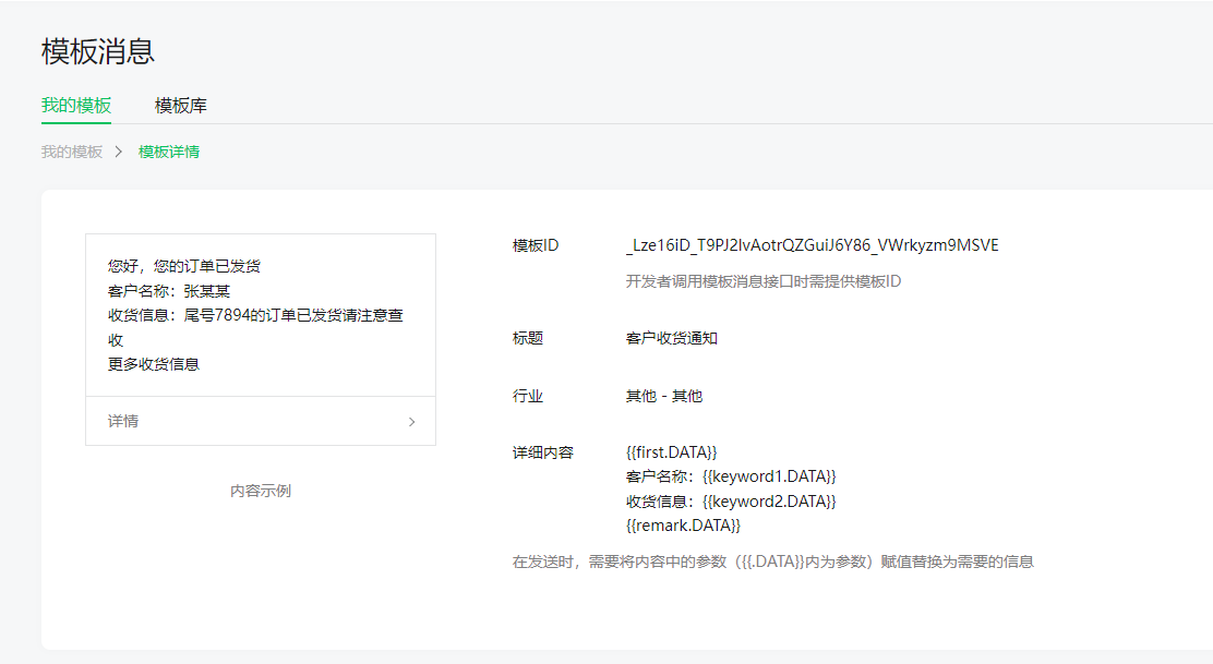 first和remark现在平台已经不展示了,就只有keyword1和keyword2,发送后的模板为: