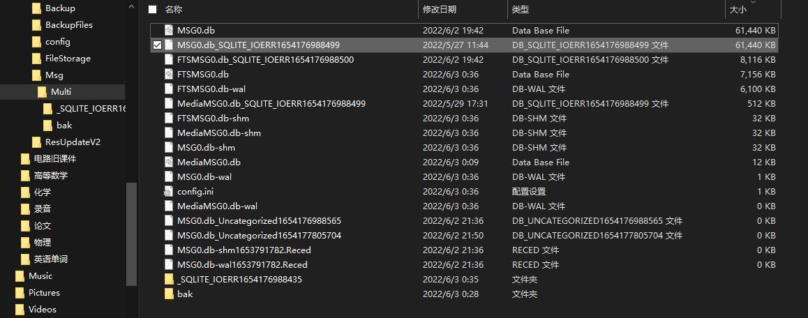 我是电脑小白,搜寻了一下网上的资料,基本上就是文件改名字。因此在multi文件夹中,我发现有很多err结尾的文件。例如XXX.db.XXX.fataerr,又或者这种IOErr结尾的。在我的认知种err就是错误嘛,肯定是这个文件在执行过程中出错了。因此结合网络上的说法改文件名,就以截图的这个文件为例,我先删除了原来的MediaMSG1.db文件,然后把这个err文件后面的一串尾缀全部删除(即重命名为:MediaMSG1.db)代替了原有的MediaMSG1.db。