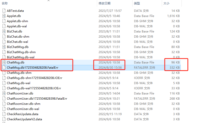 我把Msg和Multi文件夹里所有的db文件都改了,聊天数据就恢复了,注意修改时要备份数据,改微信正常时间段之前的文件,例:9月5日微信出的问题,你就找8月30日以前的对应后缀FatalErr、IOErr等文件,再对一下文件大小,选择文件大的,都改为db。