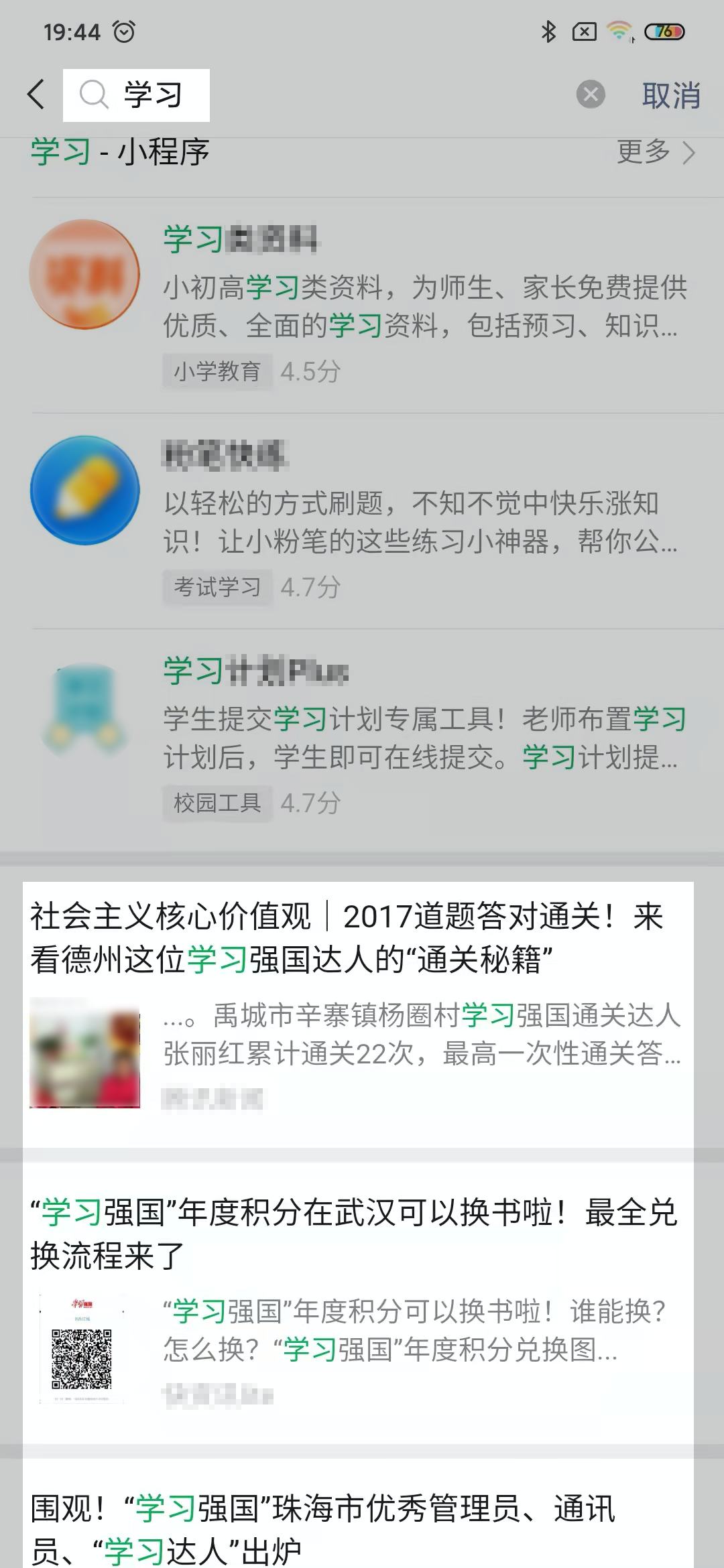例如,下图高亮部分,由小程序页面中的内容匹配到的搜索结果将不再展示。