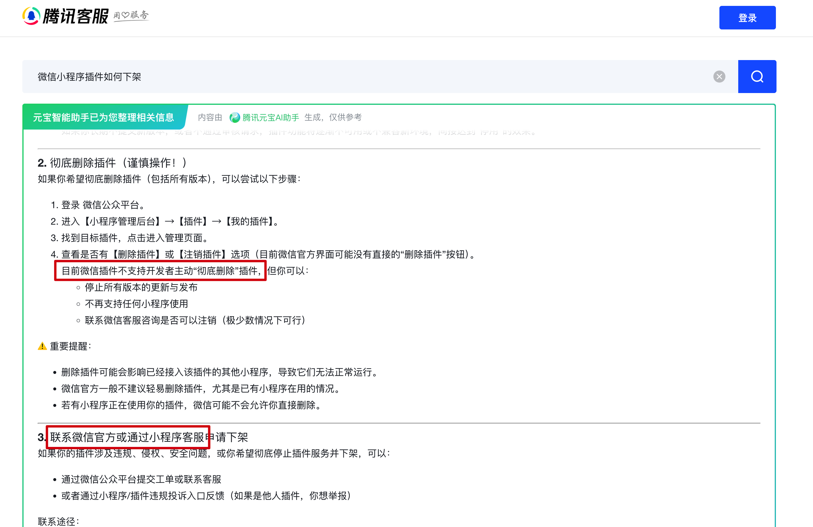 5、问了「腾讯客服」页面,AI回复如下:(告知:目前小程序管理后台不直接提供 删除插件的功能,必须联系官方客服)