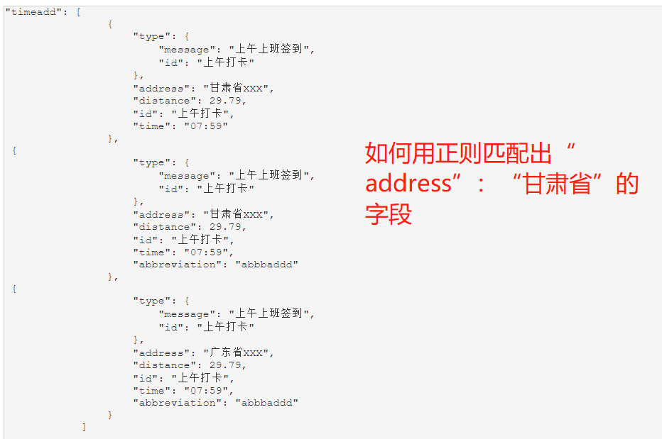 如何用正则表达式匹配出address字段中含有甘肃省的字段